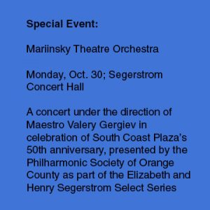 On Monday, Oct. 30, her efforts culminate with a special performance in Segerstrom Concert Hall by Mariinsky Theatre Orchestra under the direction of Maestro Valery Gergiev. It’s a celebration of South Coast Plaza’s 50th anniversary, presented by the Philharmonic Society of Orange County as part of the Elizabeth and Henry Segerstrom Select Series.