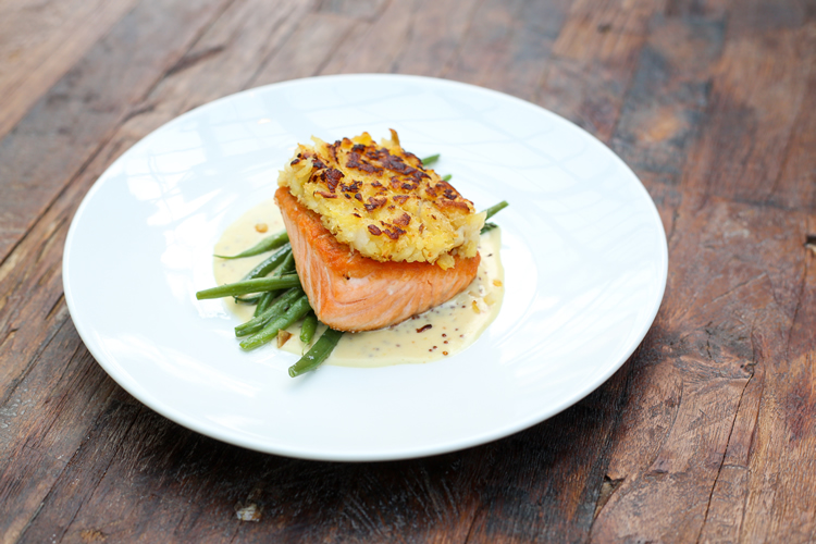 It’s an exciting time for the restaurant’s culinary team, which has added new flavors and preparations to the menu. Family-style options and seafood are newer highlights, but the real spotlight shines on dishes that pay homage to Five Crowns’ past. Classics like the beef steak Neptune—tender filet mignon topped with soft, shredded crab meat, served alongside expertly grilled asparagus and a bed of mashed potatoes—bring to mind flavors of days past. The potato horseradish crusted salmon is another updated plate, pairing a juicy fish filet that has just the right amount of kick with a crispy potato pancake. A mustard sauce adds a creamy depth, while sauteed haricot verts provide a welcome bit of crunch and help cut the richness of the dish.